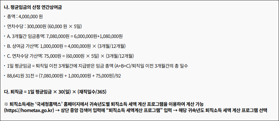 보다 정확한 계산은 고용노동부 퇴직금 계산기를 활용하면 편리합니다.https://labor.moel.go.kr/cmmt/calRtrmnt.do