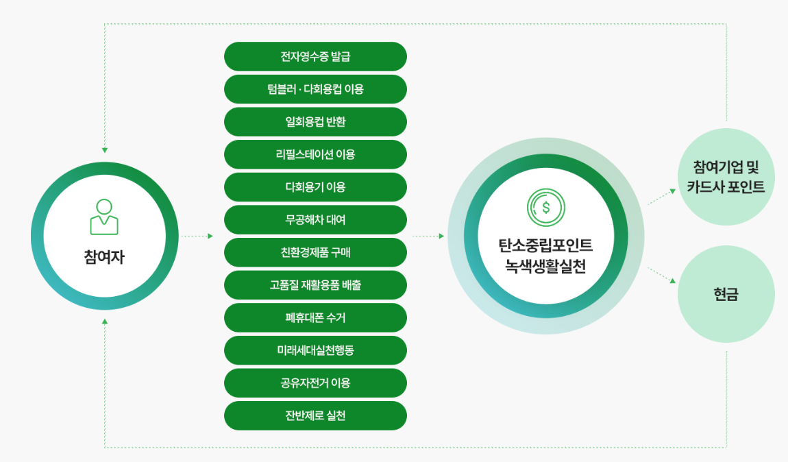 현금의 경우 한국환경산업기술원이 참여자에게 직접 지급하며, 민간 포인트는 기술원을 거쳐 각 민간 운영사를 통해 참여자에게 전달됩니다.