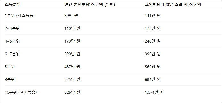 특히 요양병원에서 120일 이상 장기 입원하는 경우에는 별도의 상한액이 적용됩니다. 이는 장기 요양으로 인해 발생하는 과도한 의료비 부담을 완화하기 위한 조치입니다.